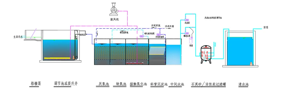 SLW-AOS一体化污水处理设备主要包括的处理单元有:水解酸化池(A池)、接触氧化池(O池)、沉淀池和中间水池以及石英砂活性炭过滤罐。其中A池和O池是生化反应的主要场所,其内布满组合填料,附着在填料上的微生物形成生物膜,分别发生缺氧和好氧反应,降解污水中的有机污染物。斜管沉淀池内安装斜管填料,经过O池处理后的污水通过竖流或斜管沉淀池进行泥水分离,清水上升通过溢流堰后进入中间水池,污泥下沉在沉淀池底部聚集,之后通过污泥泵回流或外排处理。清水进入中间水池缓存后,通过泵输送至石英砂和活性炭过滤罐进行过滤处理。石英砂过滤器是利用石英沙作为过滤介质,在一定的压力下,把浊度较高的水通过一定厚度的粒状或非粒的石英砂过滤,截留除去水中的悬浮物、有机物、胶质颗粒,最终达到降低水浊度、净化水质效果的一种过滤设备。 活性炭过滤器外壳一般为不锈钢或者玻璃钢,内部填充活性炭,用来过滤水中的游离物、微生物、部分重金属离子、除异味,并能有效降低水的色度。对水中异味、胶体及色素、重金属离子等有吸附去除作用,还具有降低COD的作用。